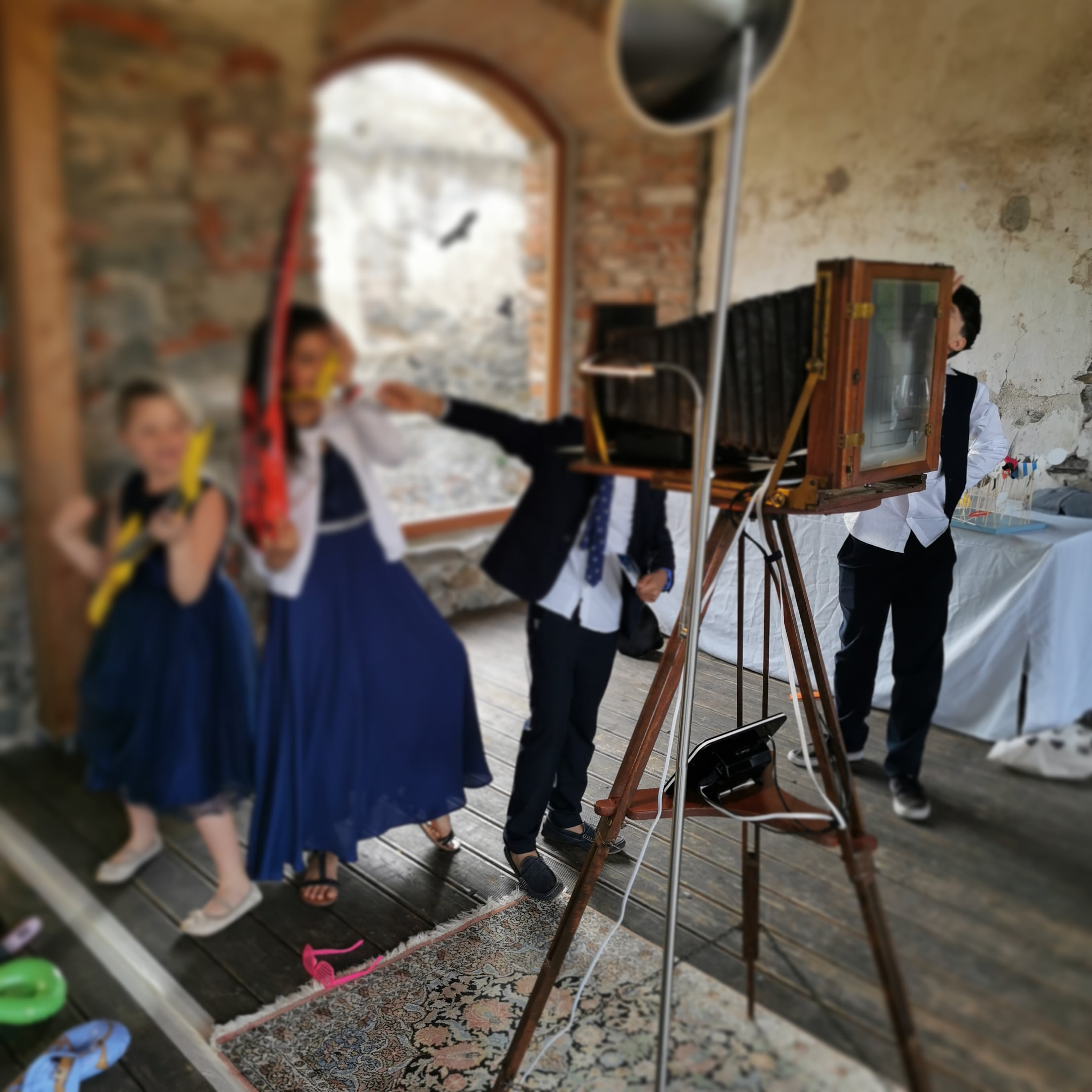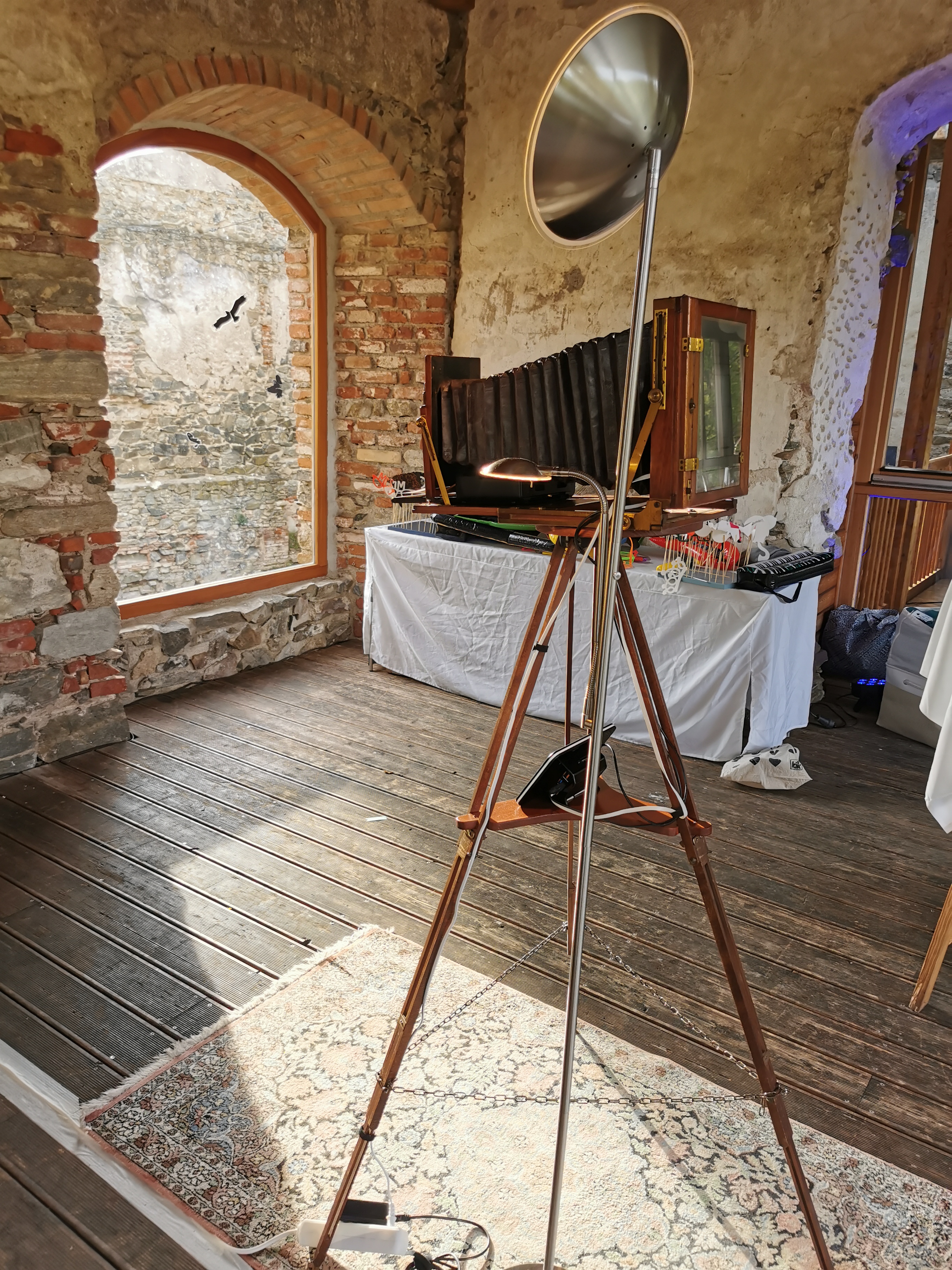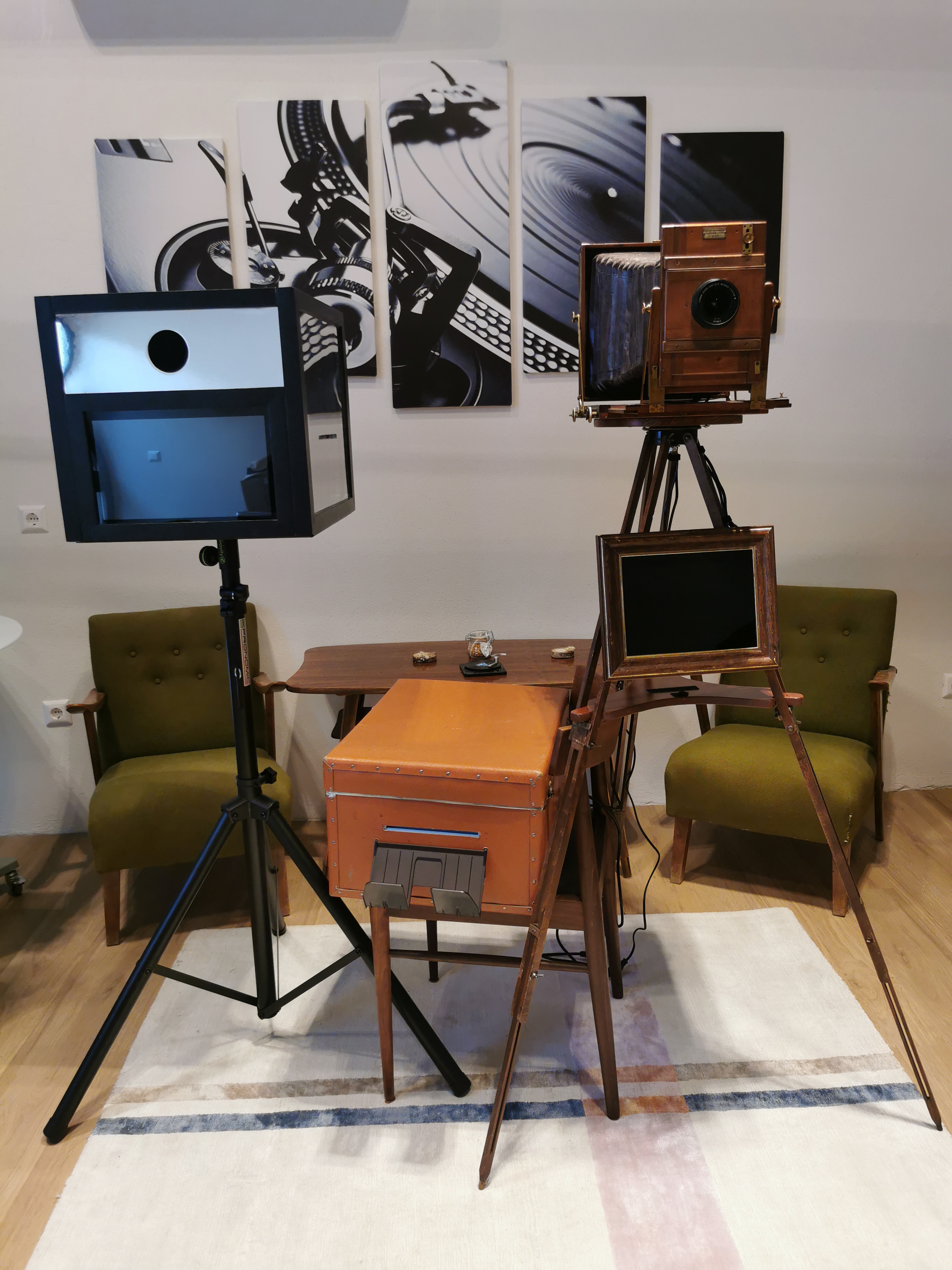 Wir haben eine alte Plattenkamera auftreiben können und sie mit einer Spiegelreflexkamera, Computer, Modem , und rustikal eingerahmten Touch Display ausgestattet.